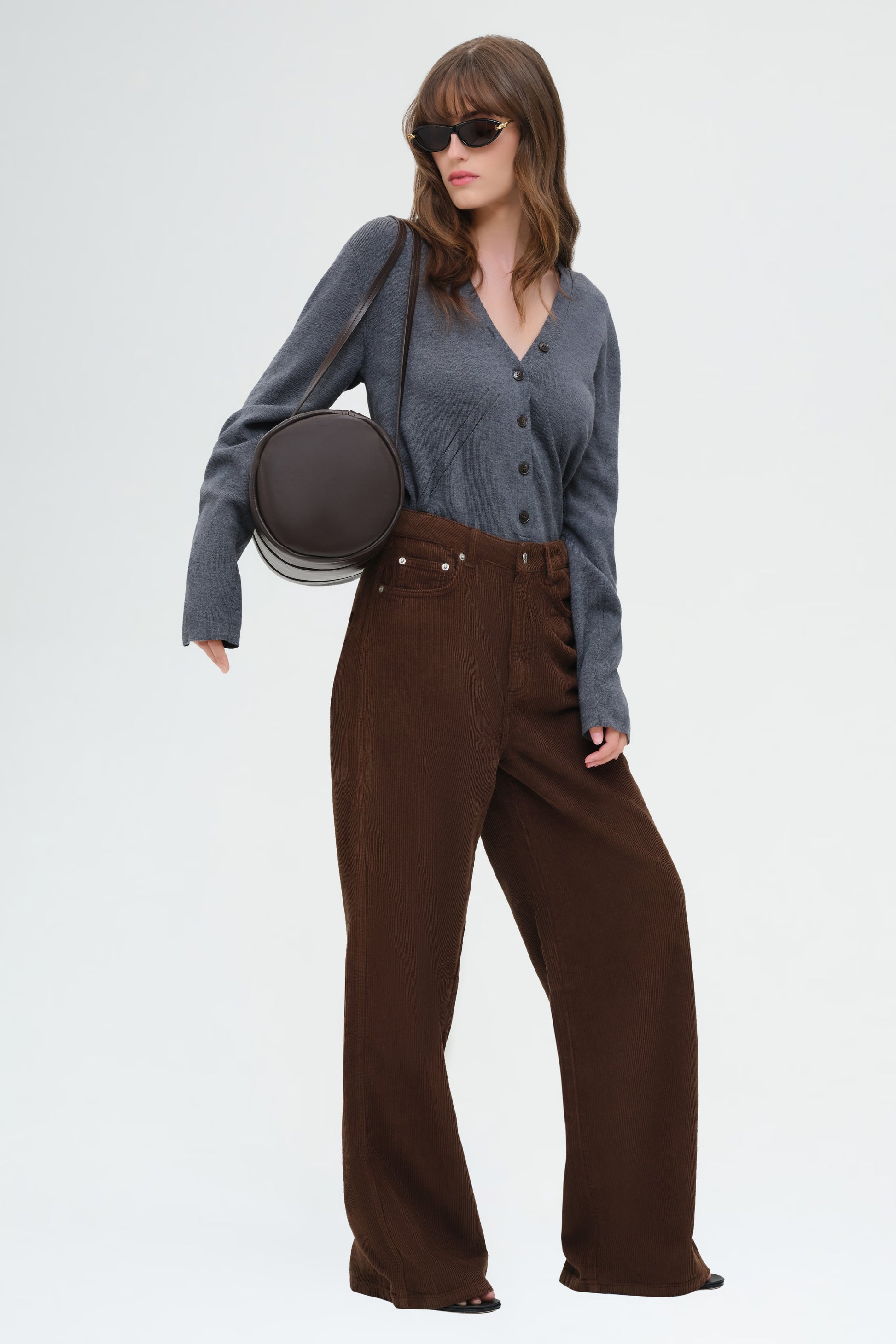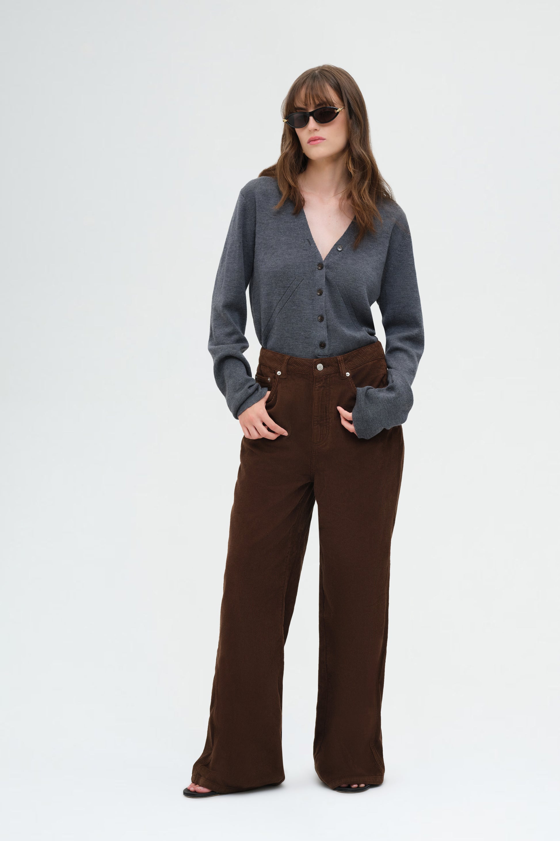 This long-sleeve bodysuit features a deep V-neckline with button details and a sleek, tailored fit for a modern, versatile look.