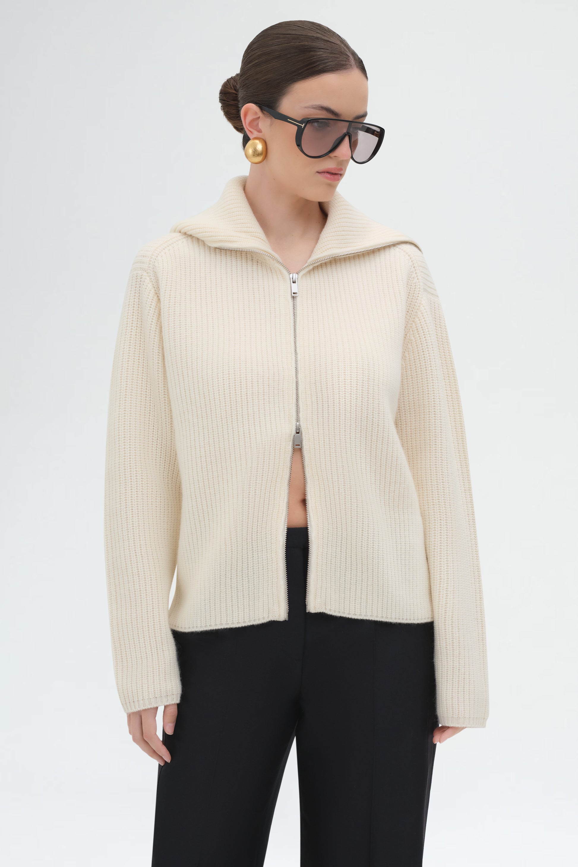Structured wide collar, long sleeves, and a front zip closure. Crafted in a soft cream knit for a modern, minimalist look — perfect for layering through the season.