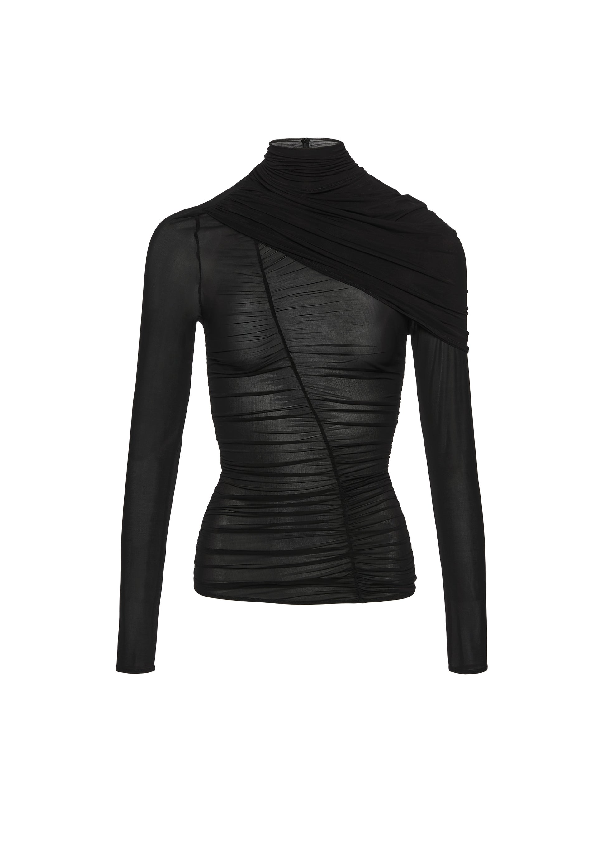 A striking long-sleeve top with sheer detailing and an asymmetric draped neckline. Sleek, modern, and perfect for elevated evening looks.