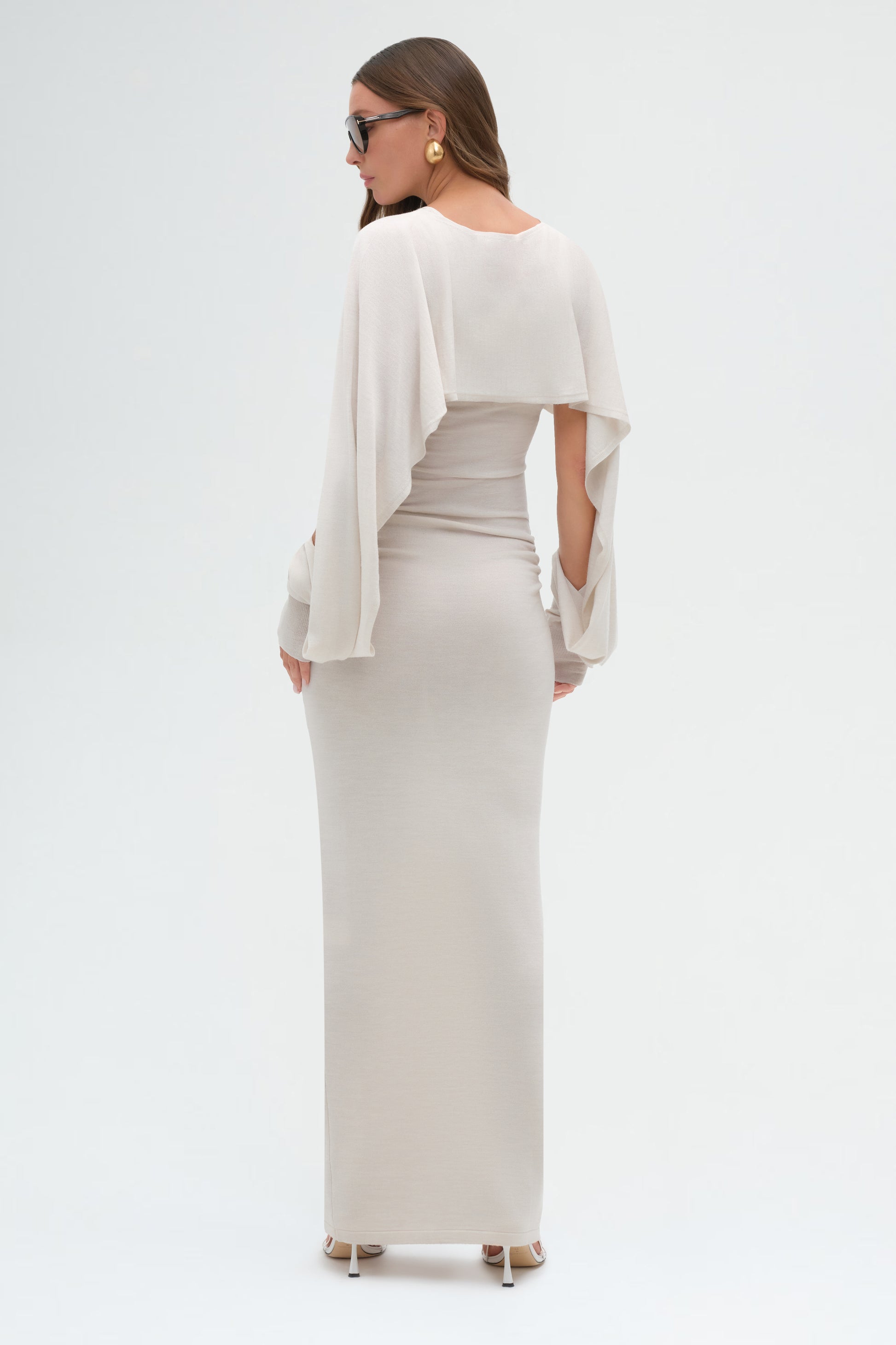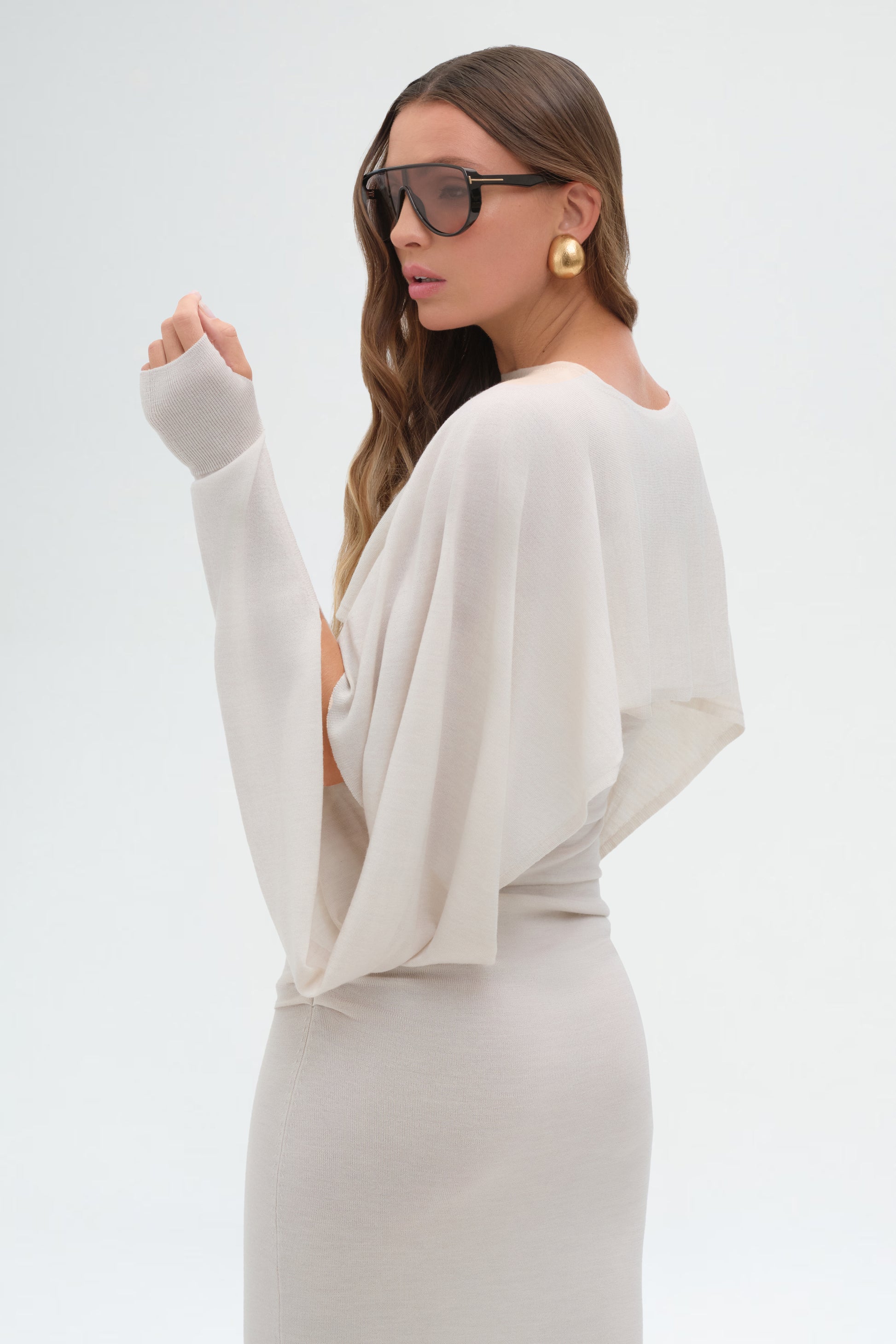 Sophisticated midi dress featuring a sculpted cutout neckline, long sleeves, and a fitted silhouette. A modern statement piece that balances elegance and allure.