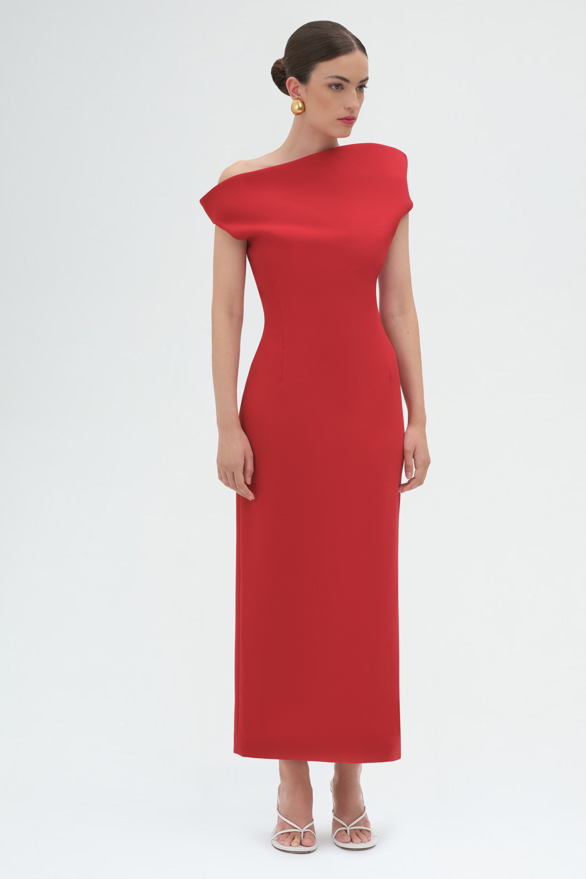 Bold and elegant, this fitted red midi dress features a sleek assymetric neckline and a sculpted silhouette, perfect for evening and special occasions.