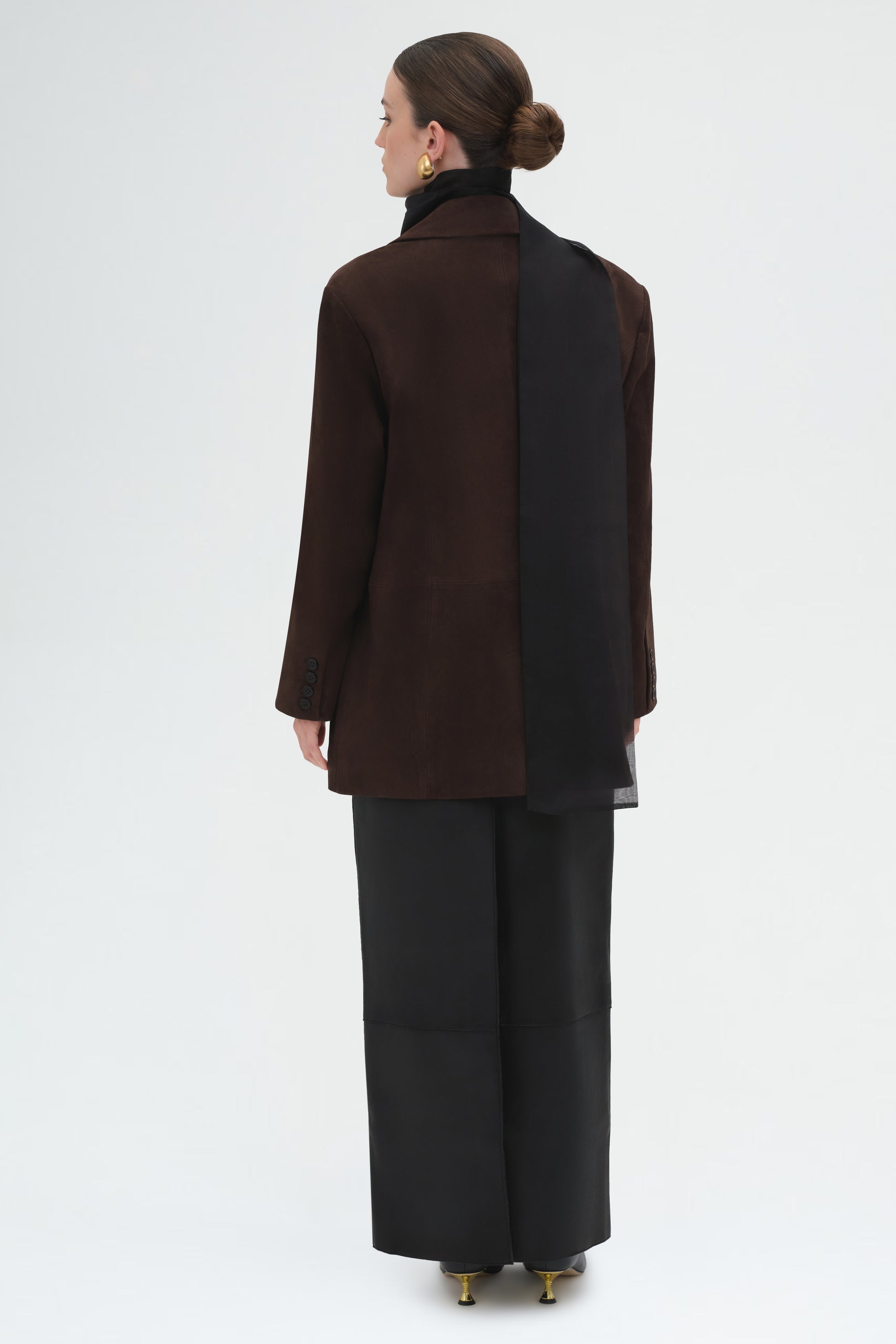 Brown suede-effect blazer with button closure, front pockets, long sleeves, and bead embroidery for a refined statement look.