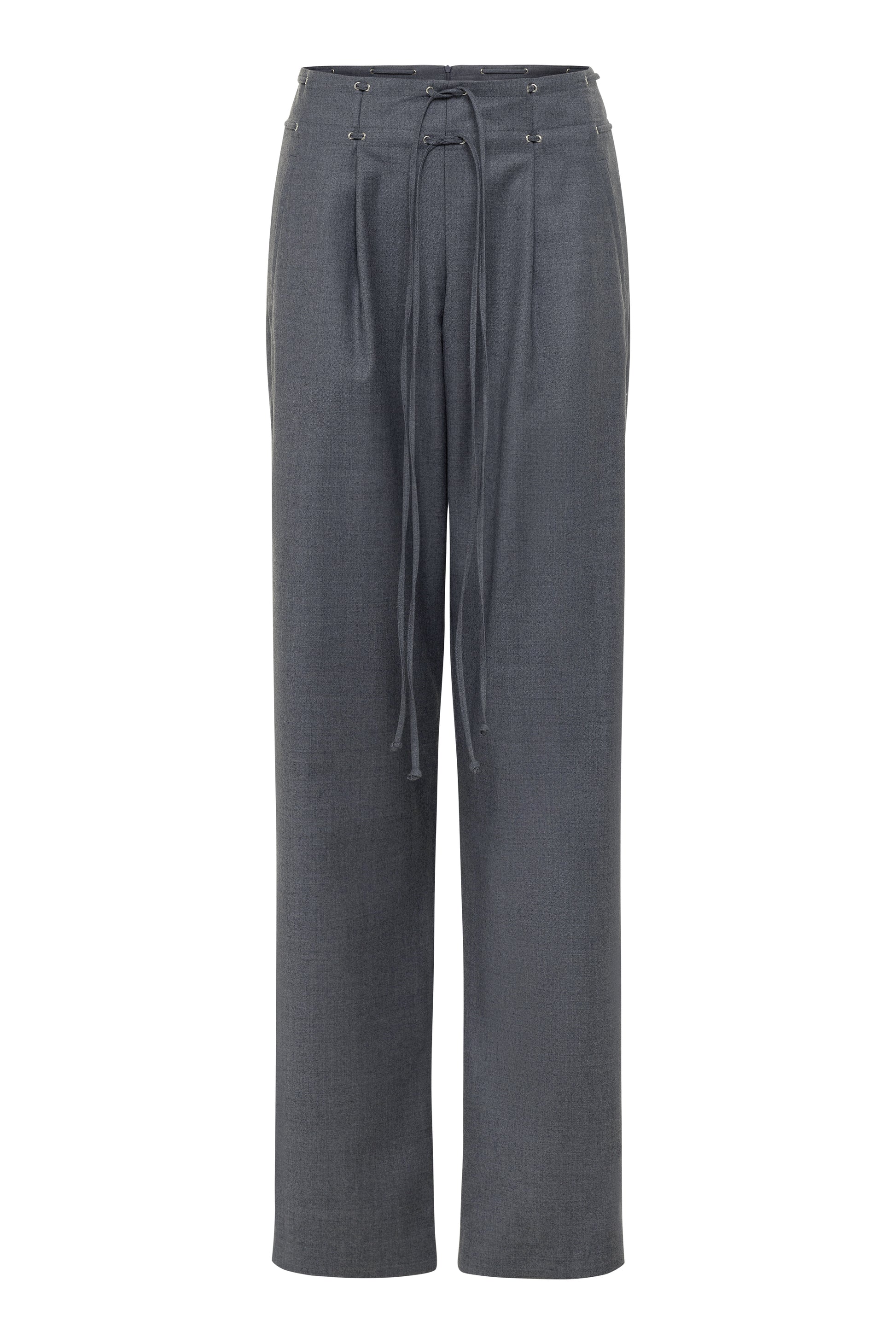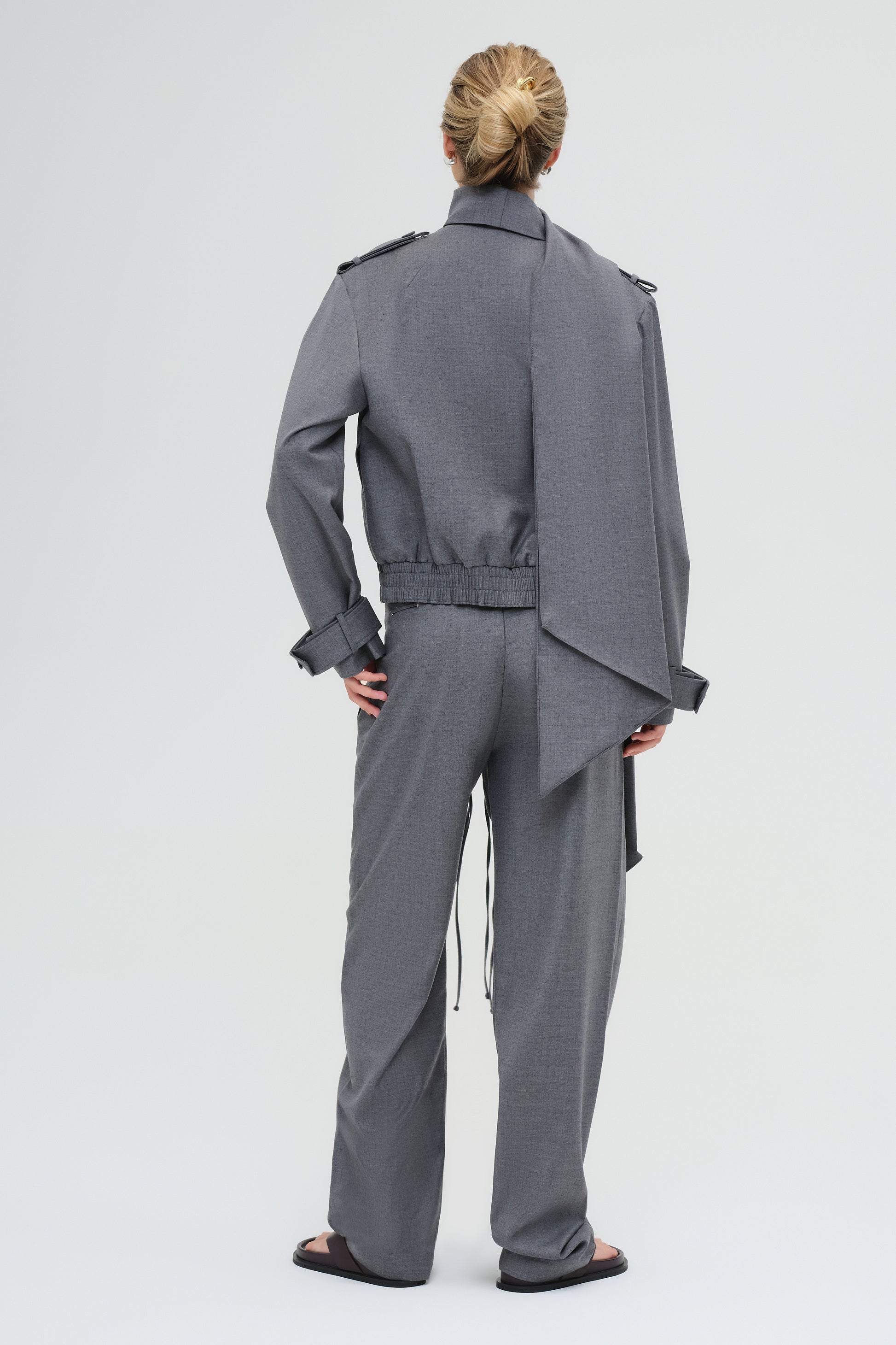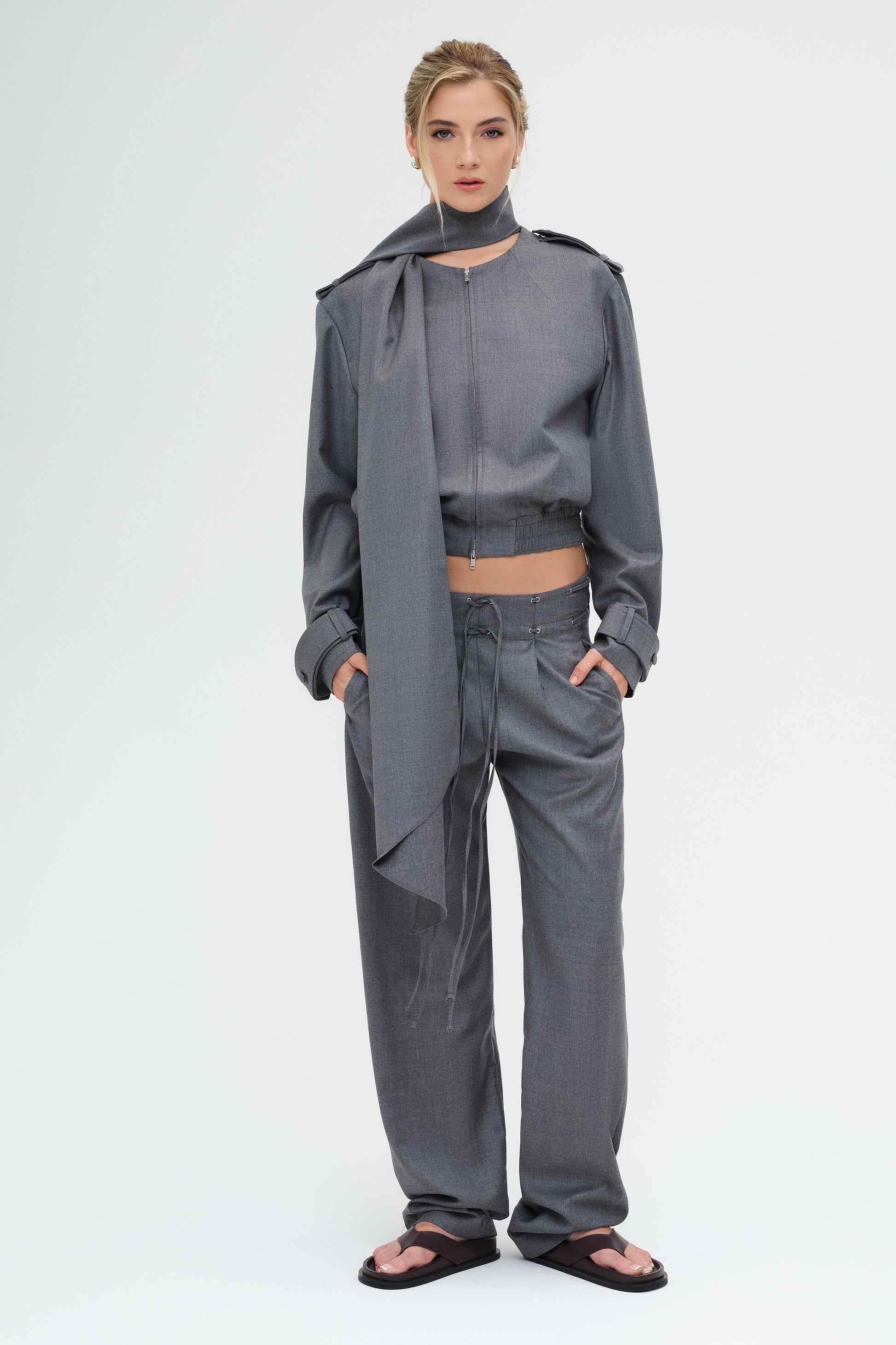 Tailored with precision, these high-waisted pants feature a fluid silhouette and a refined textured finish. Designed to elongate the figure with a clean, minimalist cut, they offer effortless sophistication for any occasion. Perfect for pairing with elevated essentials or the matching jacket for a statement look.