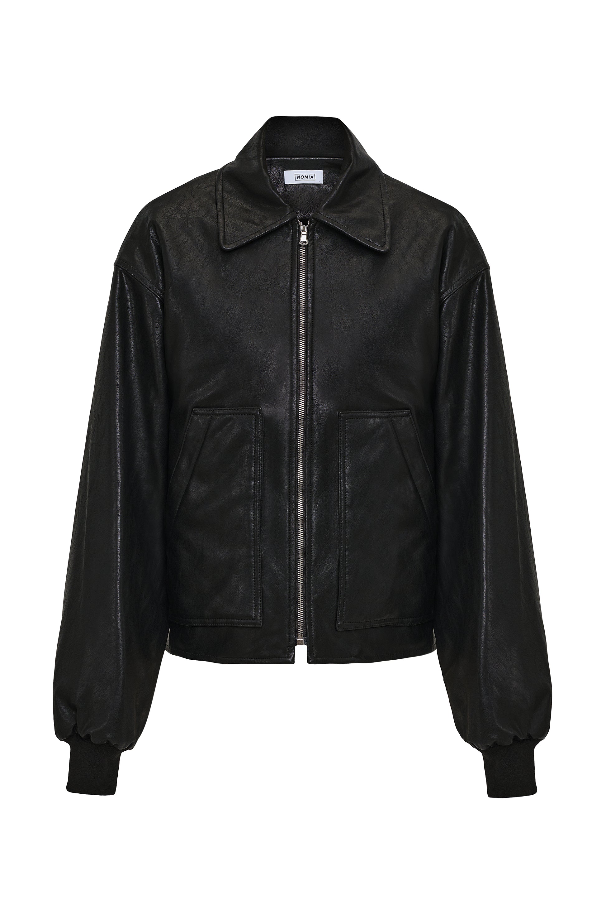 A cropped bomber-style jacket in faux calf, finished with a sleek silvertone zipper for a modern edge.