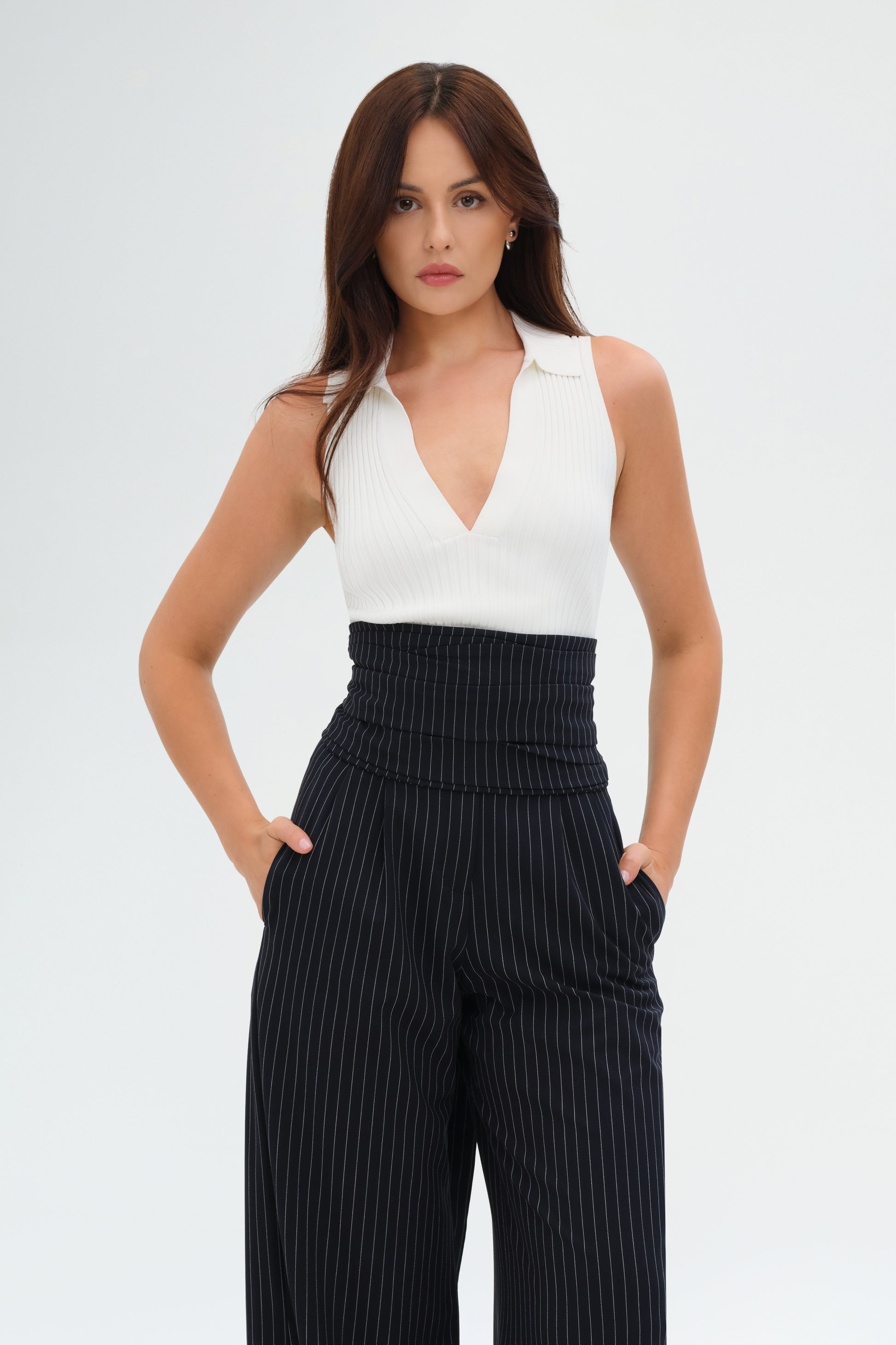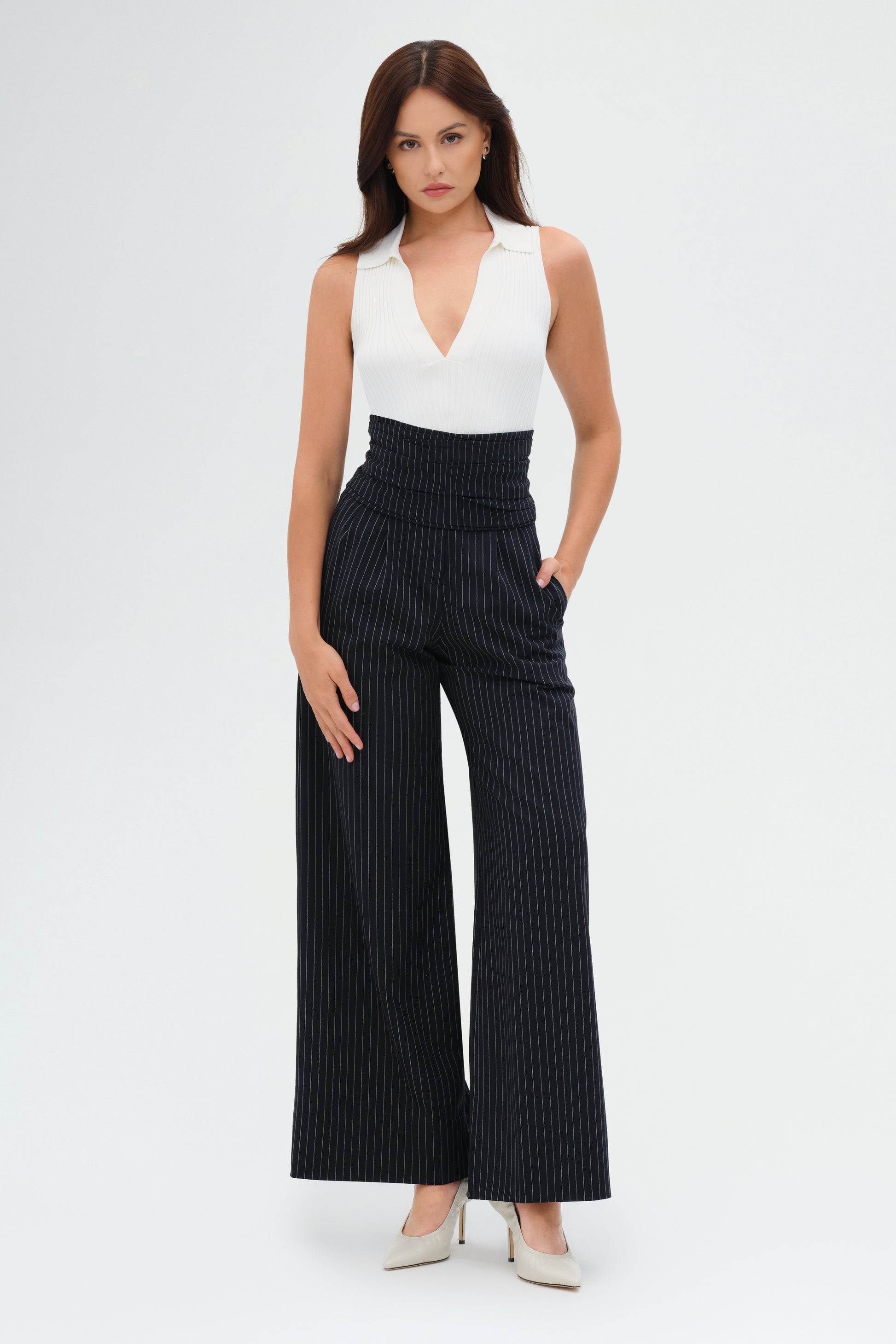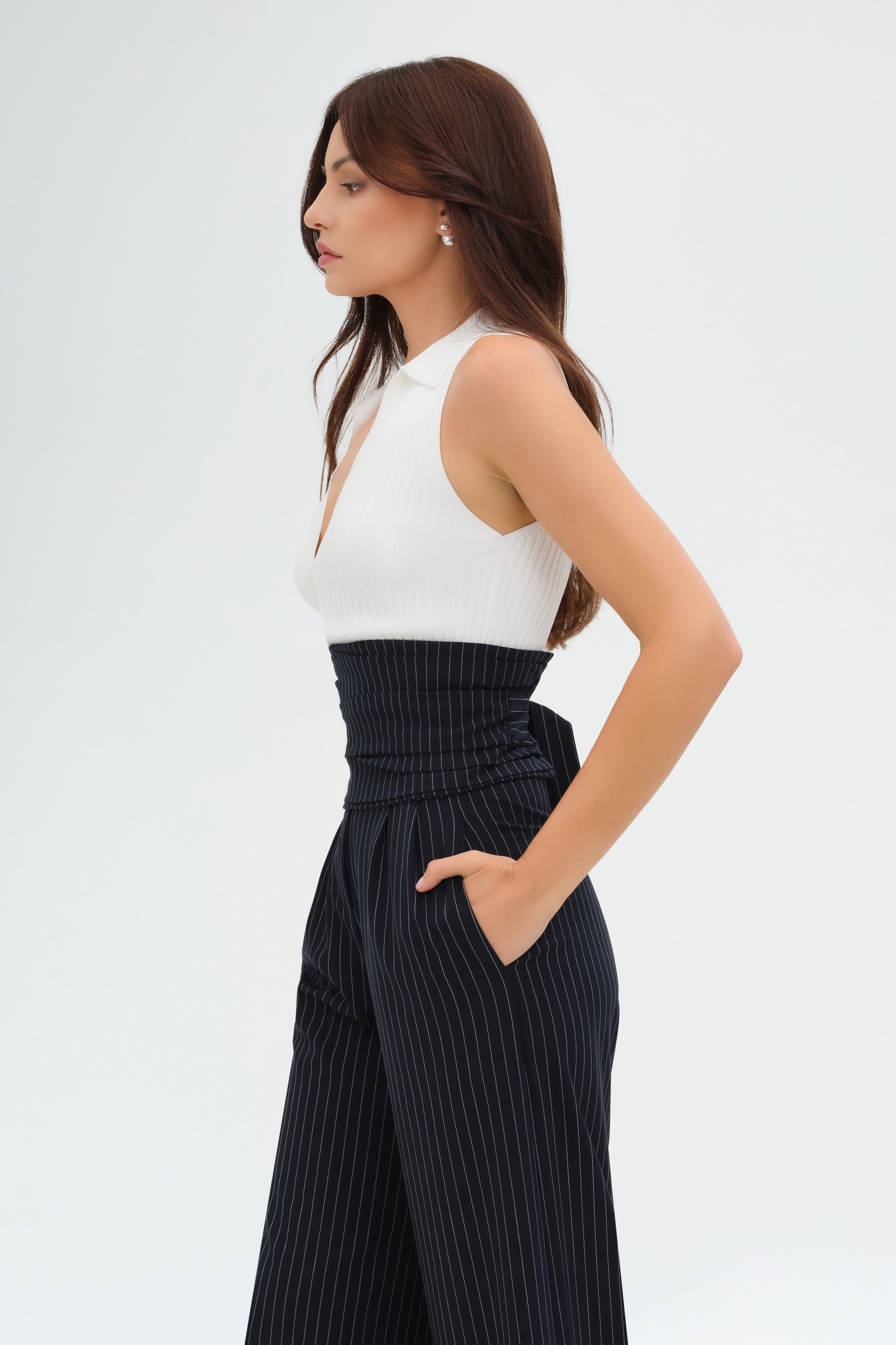 High-rise tailored pants featuring side pleats that define and sculpt the silhouette. Designed with an asymmetrically draped belt for a customizable fit. A statement piece for the modern woman — confident, refined, and unapologetically in charge.