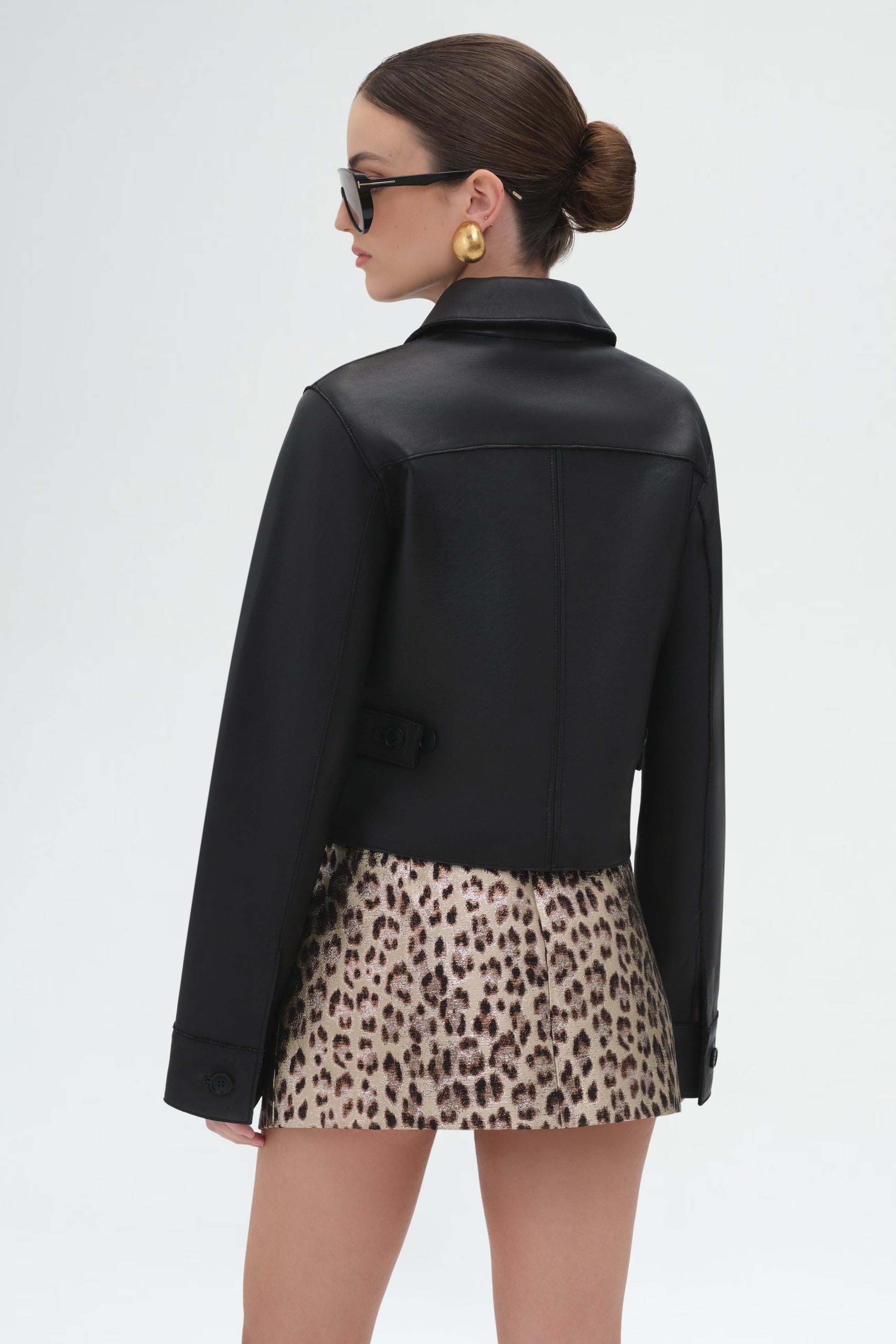 Black cropped leather-effect jacket with button closure, front flap pockets, and long sleeves, designed in a 50 cm length for a sleek modern fit.