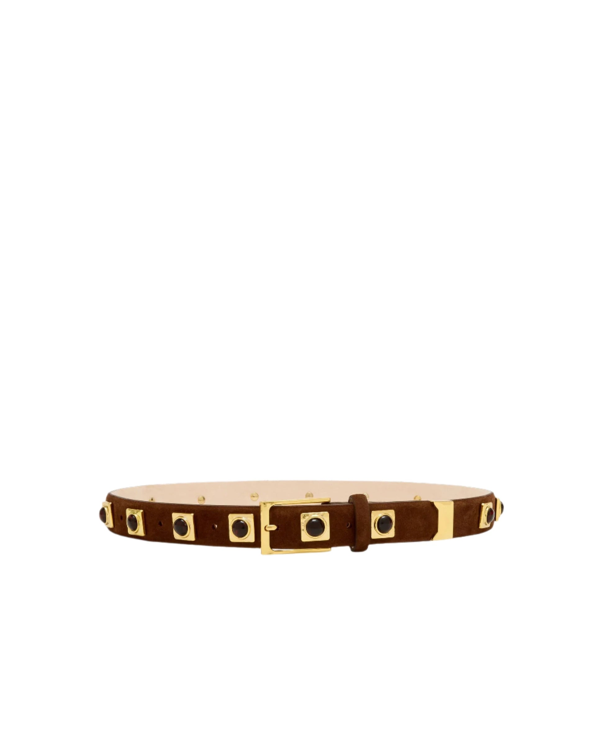 Made from soft suede Italian leather, this limited-edition belt stands out with jewelry-inspired details—featuring brown stone studs and a structured rectangular buckle crafted from 24k gold-plated brass. A refined statement piece with timeless edge.