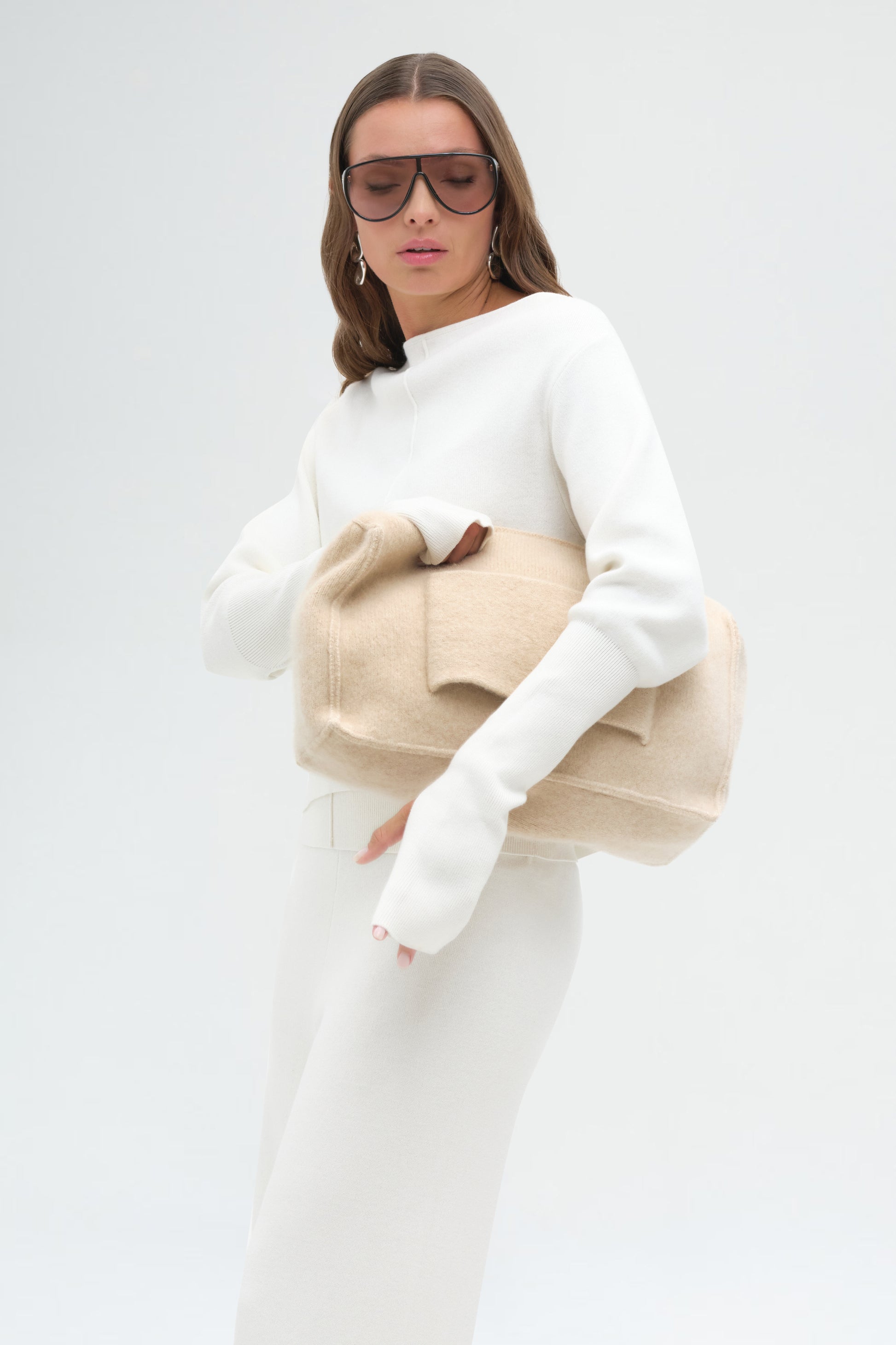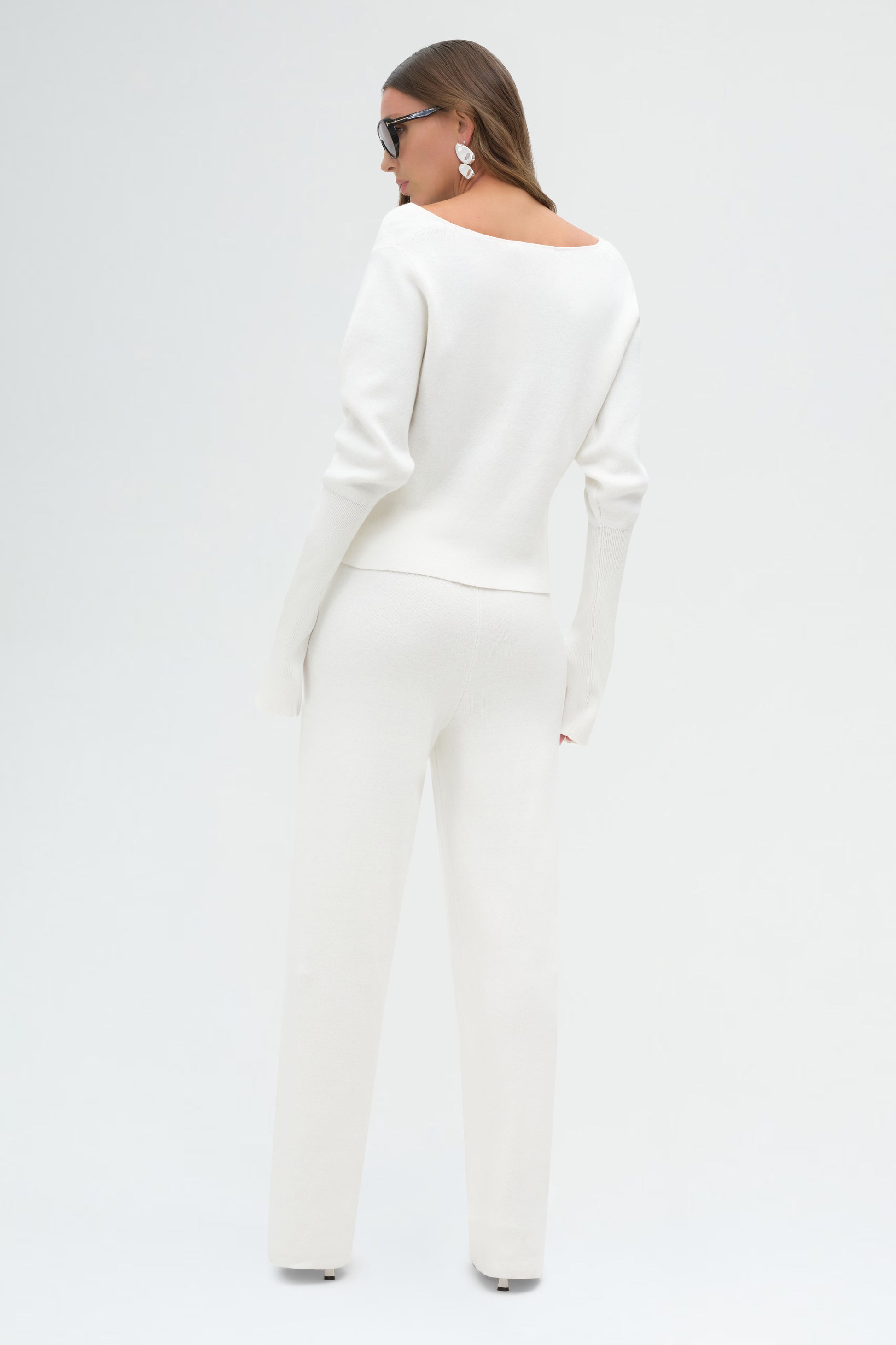 Minimalist off-the-shoulder knit top with elongated sleeves and a sleek, modern silhouette. Designed for effortless elegance and versatile styling.