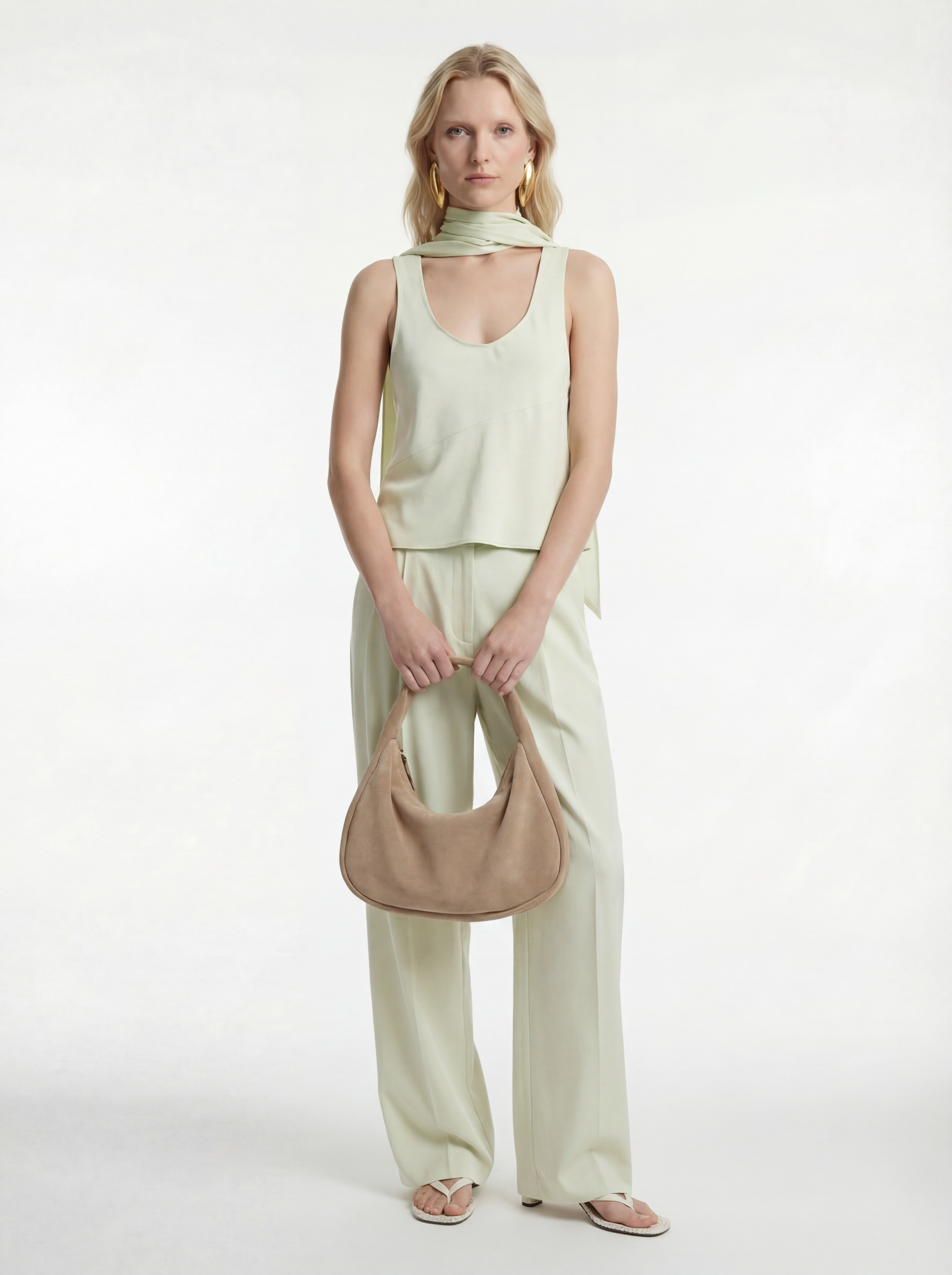 Soft draped sleeveless top in a light neutral hue, featuring a relaxed silhouette with a scoop neckline and fluid asymmetric hem. Finished with a detachable scarf detail for an elevated, modern touch, wear it with or without the scarf to transition effortlessly from day to night.