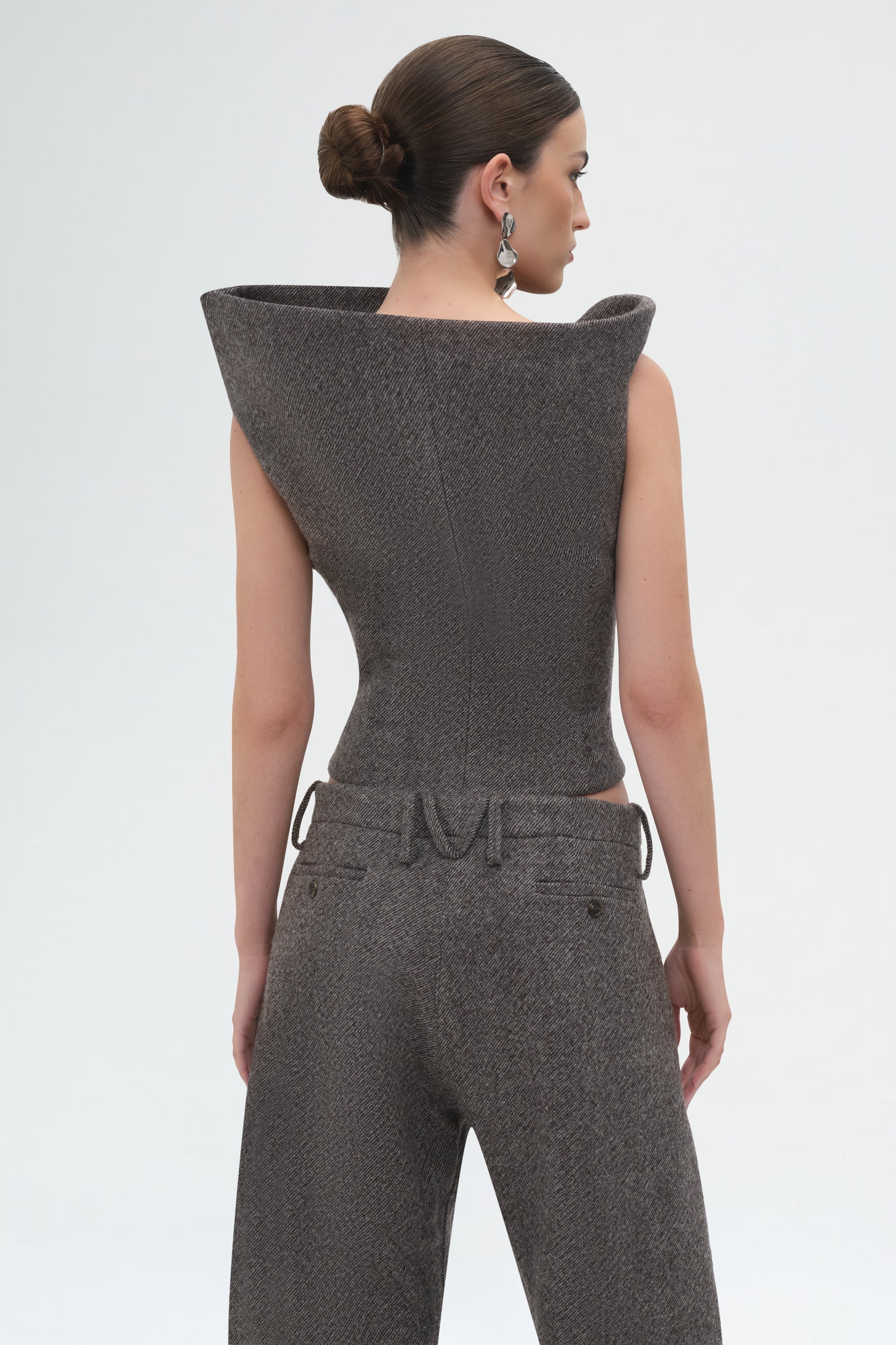 Wool-blend sleeveless top featuring a bold asymmetric neckline and sculpted fit. Designed with a cinched waist and concealed back zip for a sleek, modern silhouette.
