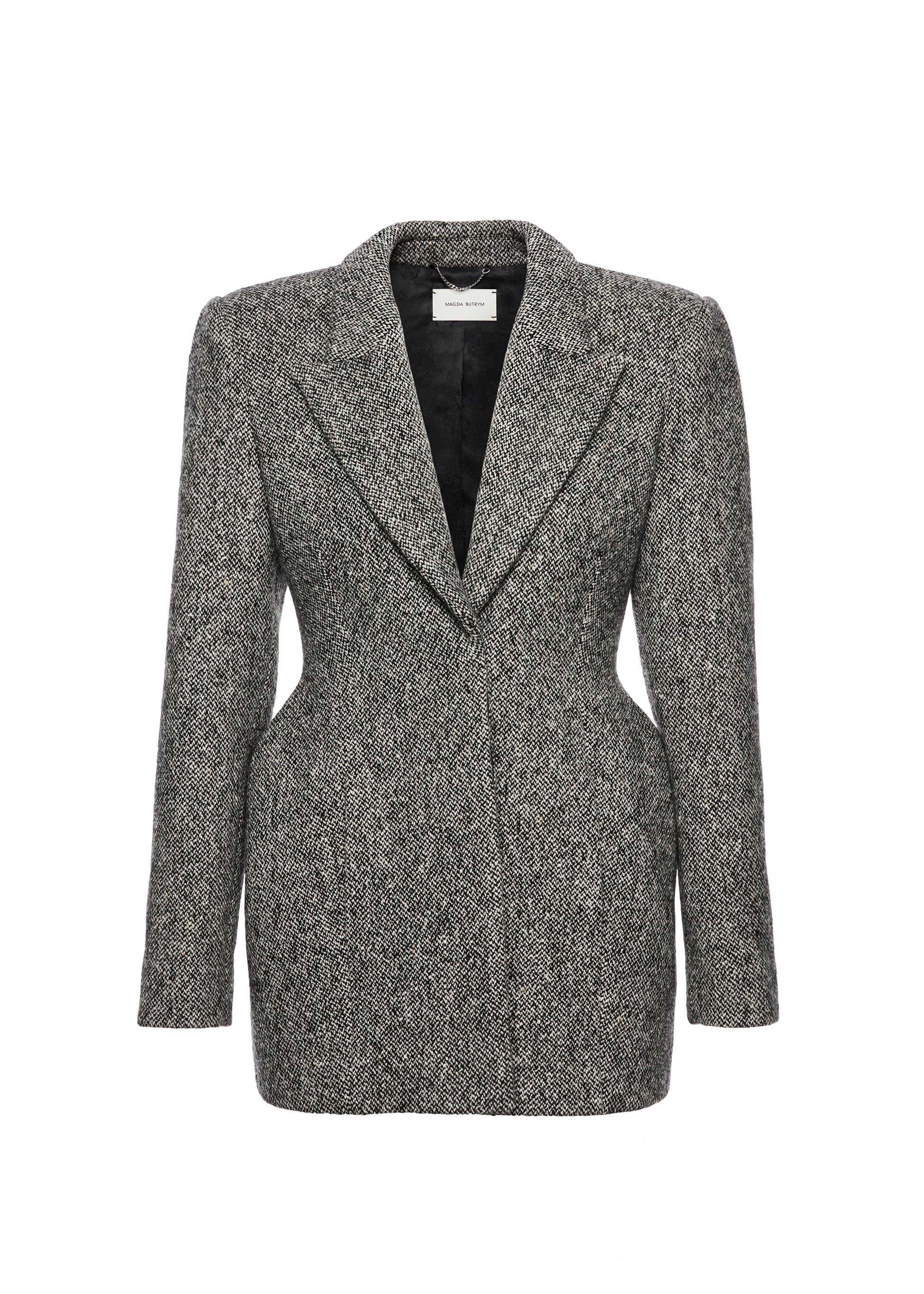 Wool and cashmere blazer in grey melange with Magda Butrym’s sculpted hourglass silhouette, hip pads, and couture-inspired tailoring.