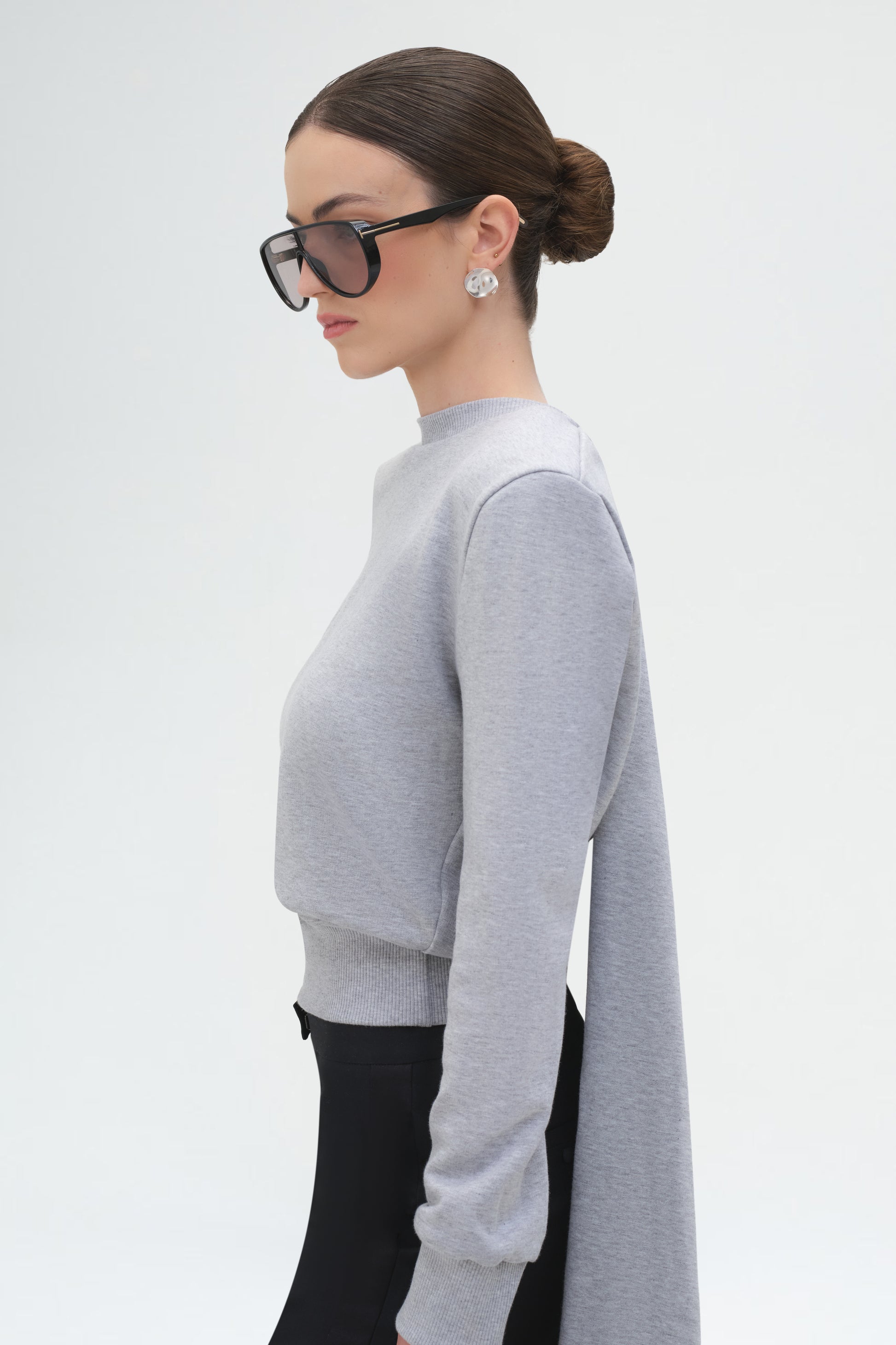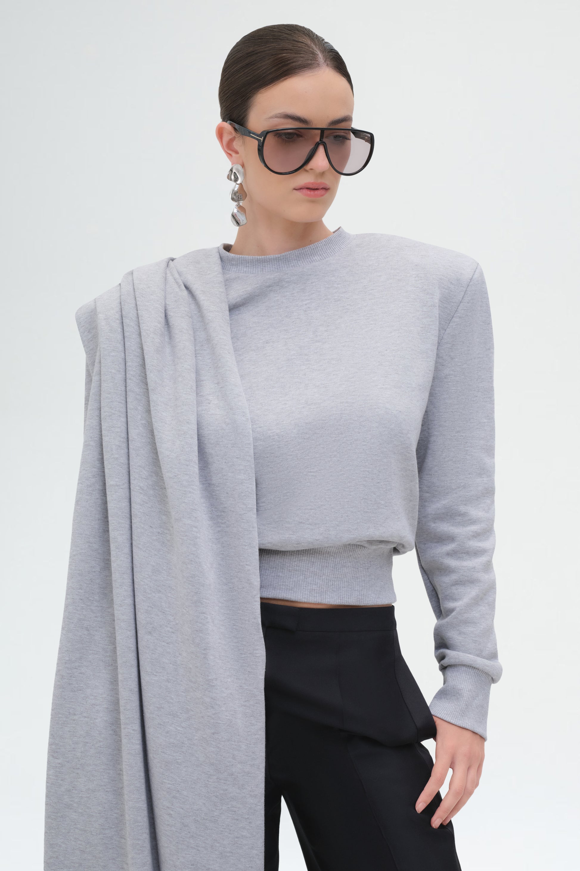Sculptural asymmetrical earrings with a fluid, rose-petal silhouette. Featuring a bold three-tiered drop paired with a singular form, these modern statement earrings are designed for pierced ears.