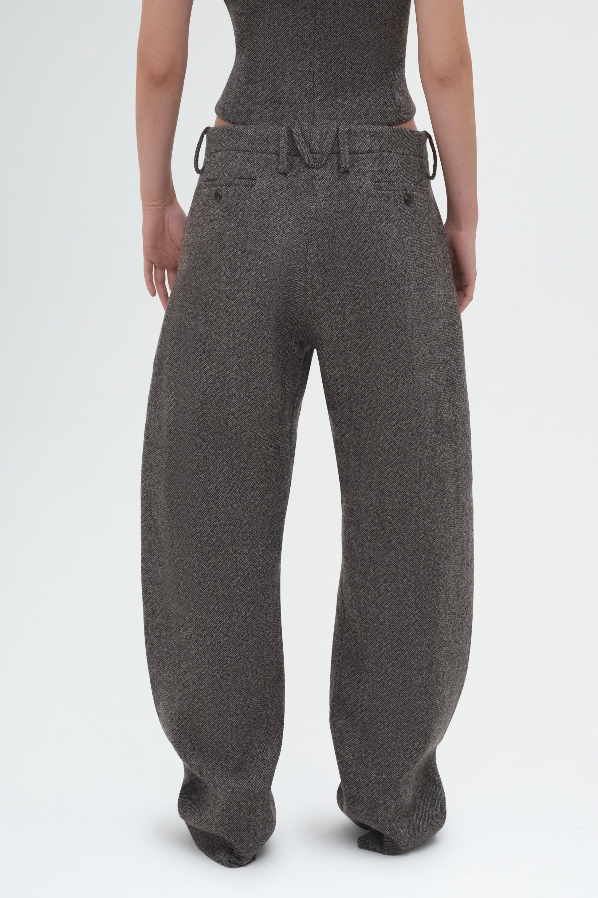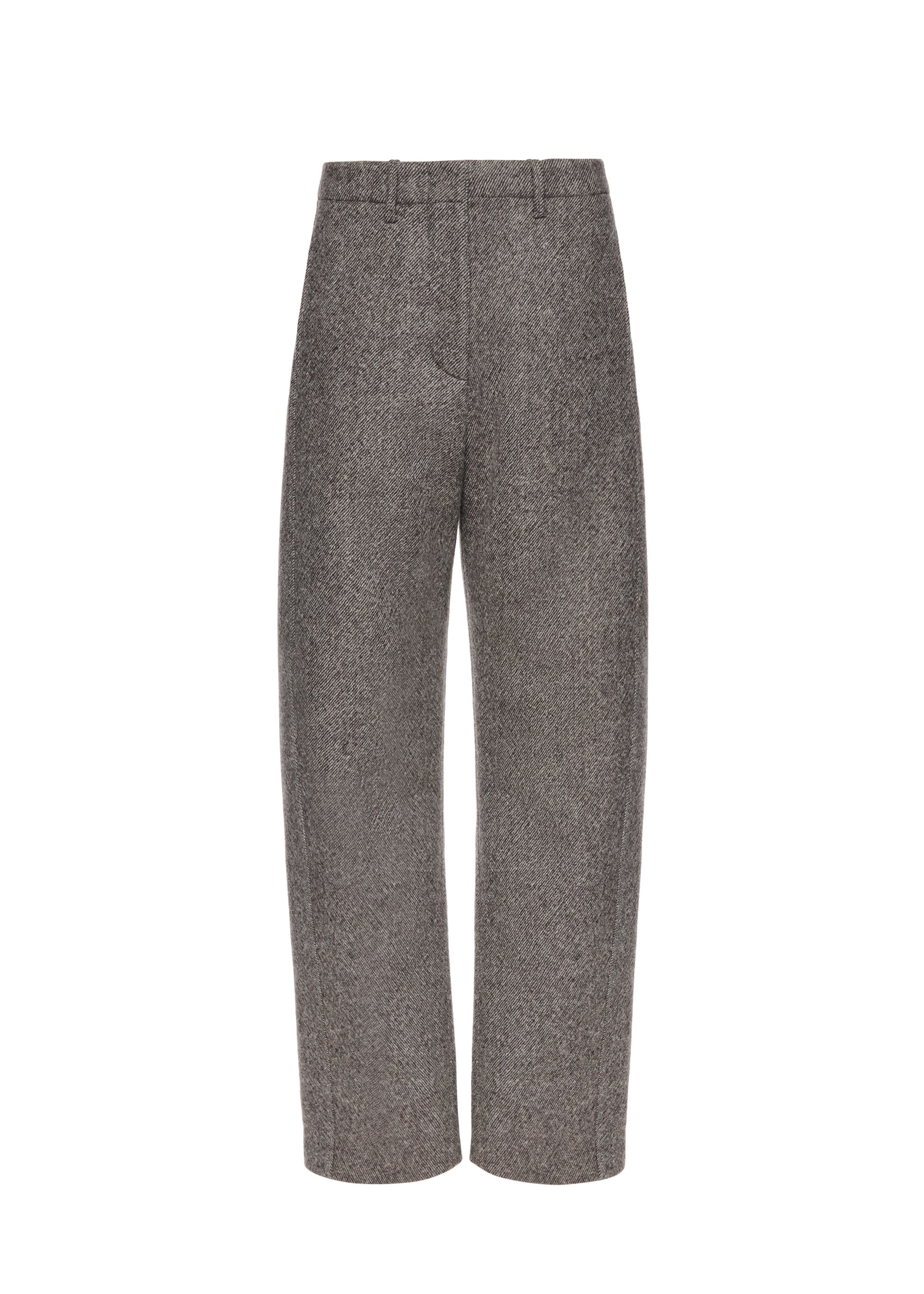 Tailored wide-leg trousers with front-shifted seams for a refined silhouette. Detailed with welt pockets, dropped waist, and signature “M” motif belt loops.